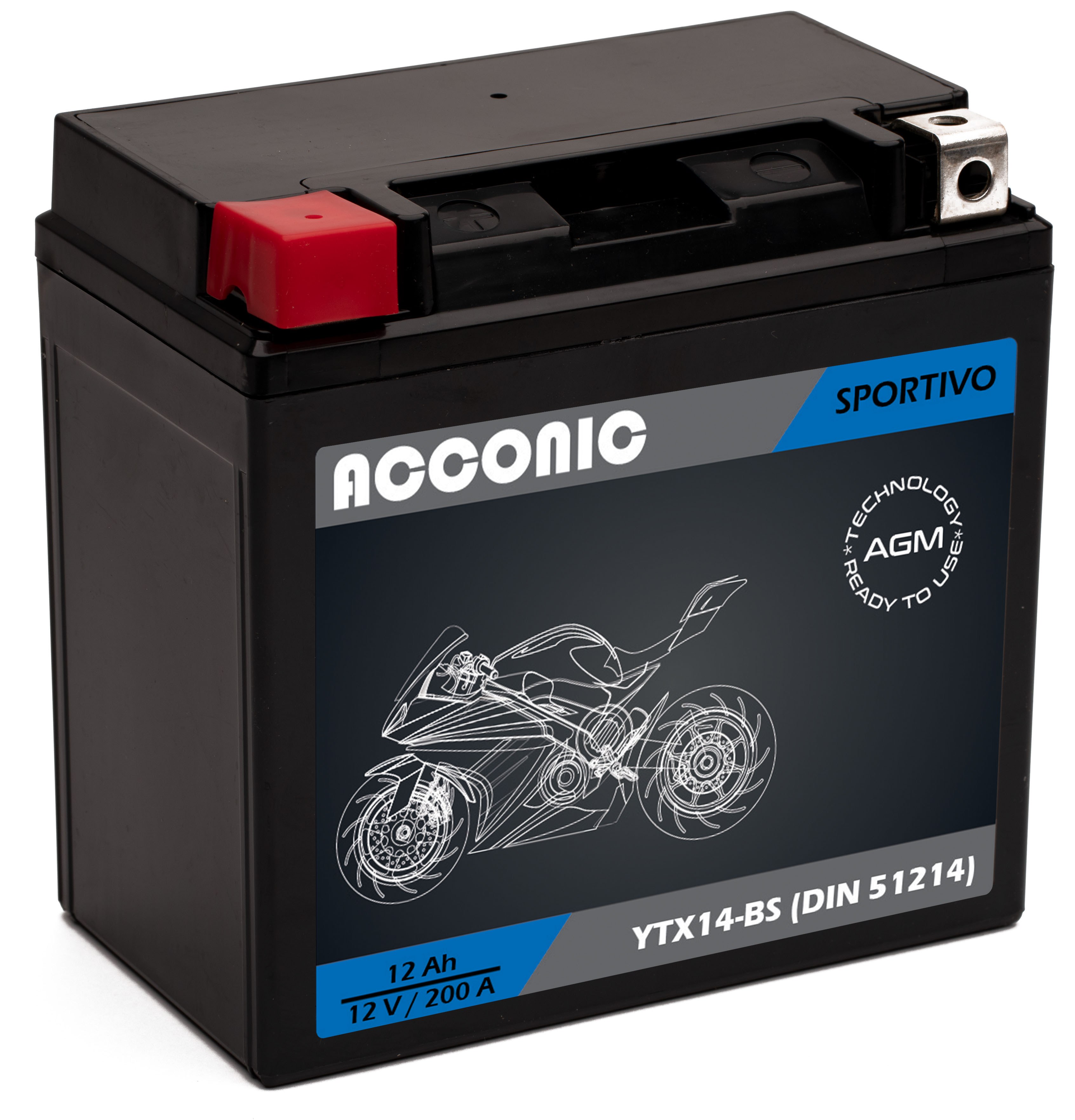Acconic Sportivo AGM YTX14-BS Motorradbatterie 12Ah 12V (DIN 51214)Acconic AGM - Erstklassig. Verlässlich. Preiswert.