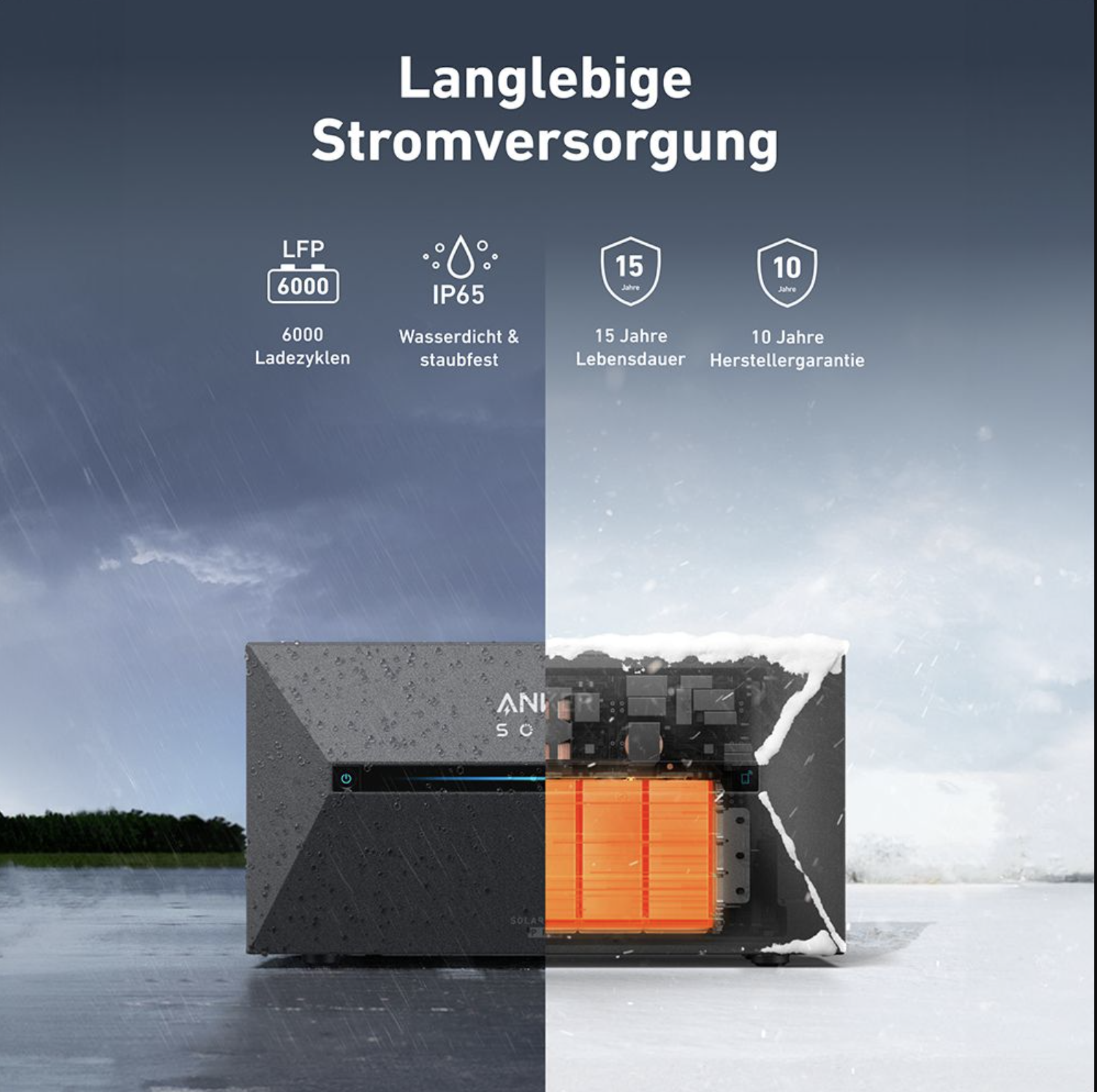 Die Thermal Boosting Technology ermöglicht durch präzise Echtzeit-Überwachung den Betrieb der Batterie bei bis zu -20°C. Durch die effektive Wärmeableitung sorgt die Technologie außerdem für erhöhte Sicherheit und optimale Lade- und Entladeeffizienz. Dies steigert die Gesamtleistung und verlängert die Lebensdauer der Komponenten. Durch die IP65-Schutzklasse ist die Solarbank wasserdicht und staubfest.