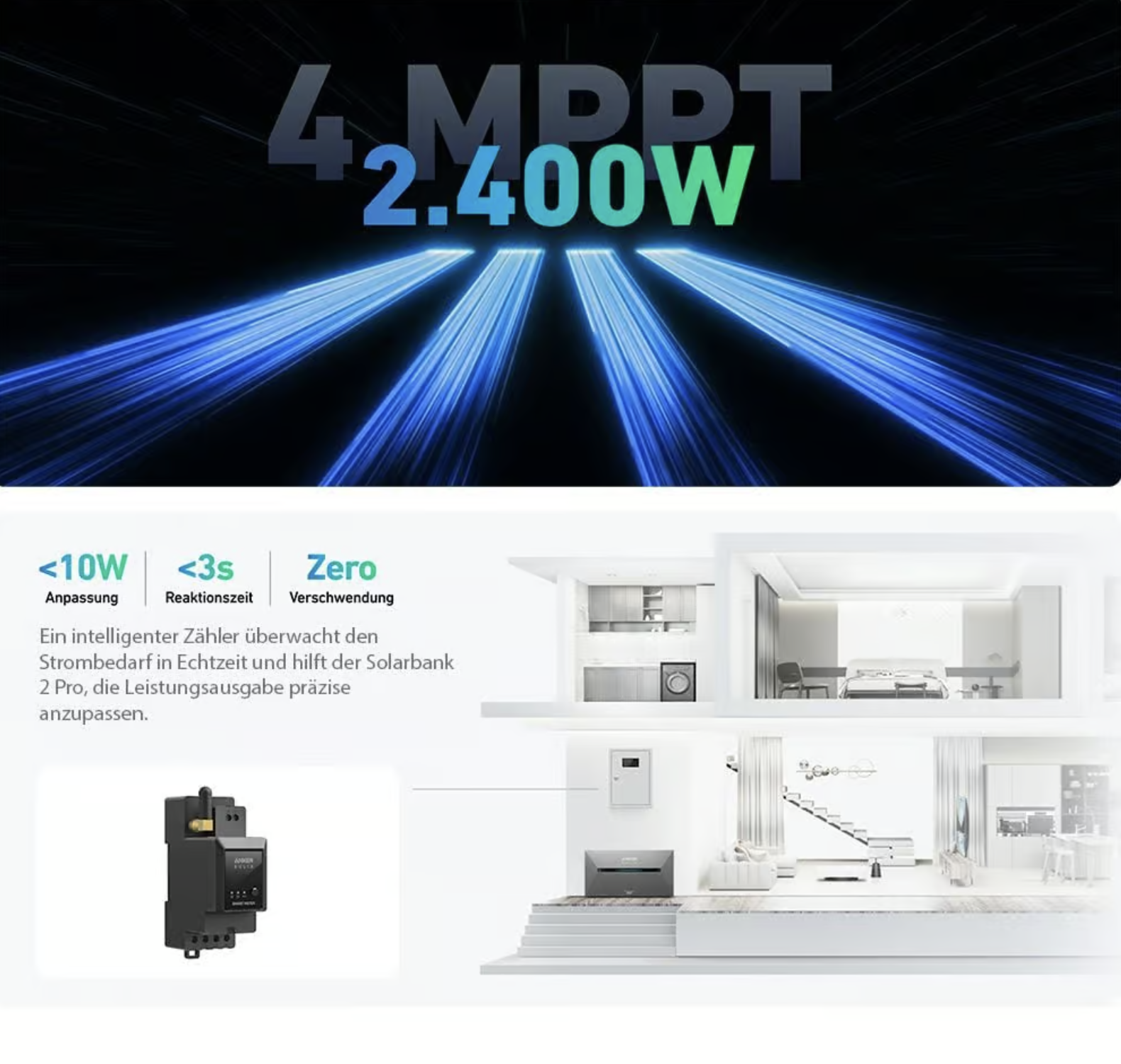 Die Solarbank 2 E1600 Pro (MPN A17C13Z1) von Anker ist der erste All-in-One Speicher mit 4 MPP-Trackern und max. 2400W Leistung für dein Balkonkraftwerk. Speichere die Solarenergie im 1600Wh-Akku und versorge dein Zuhause mit 800W AC-Leistung. Die Solarbank integriert in seinem schlanken Design sowohl Mikrowechselrichter, PV-Hub als auch Akku in einem. Der modulare Aufbau sorgt für einfache Installation, ohne Bohren oder Kabelsalat. Mit der erweiterbaren Kapazität auf bis zu 9,6 kWh und der Thermal Boosting Technology garantiert sie eine zuverlässige und effiziente Energieversorgung. Sie ermöglicht dir eine jährliche Stromkosteneinsparung von bis zu 251€* und sorgt somit für eine erhebliche Reduzierung deiner Energiekosten.