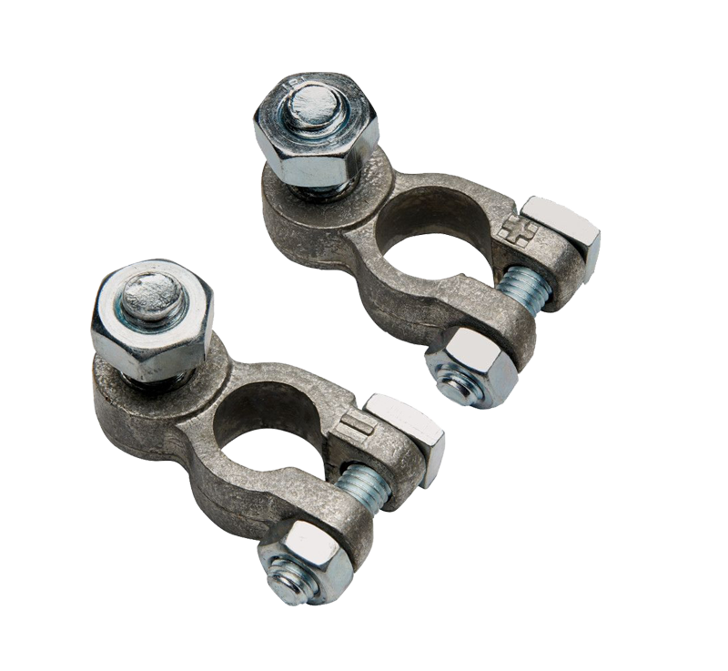 Mit diesem Satz Polklemmen für Standardpole können Sie eine schraubbare Verbindung zum Anschluss von Kabelschuhen an die einzelnen Batteriekontakte herstellen. Die Polklemmen gewährleisten eine mechanisch sichere Verbindung und lassen durch ihre große Kontaktfläche sehr hohe Ströme zu, wie sie beim Starten eines Motors auftreten. Der Kabelanschluss erfolgt über Kabelschuhe auf einer M8 Schraube mit Mutter und Unterlegscheibe.