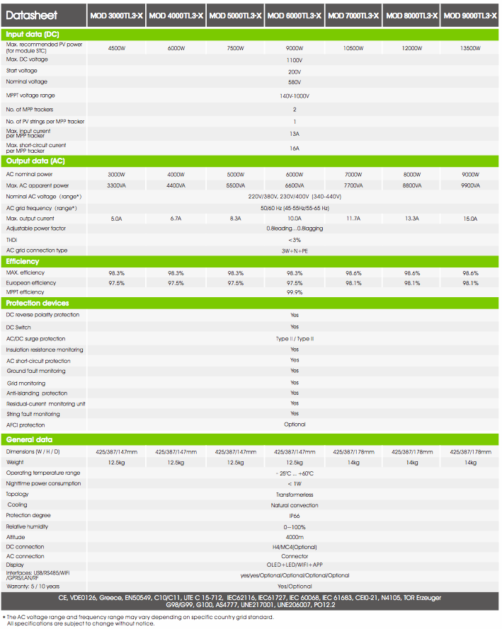 Die maximale Ausgangsleistung des Wechselrichters liegt bei 11.000W und das Gerät ist mit einer Photovoltaik-Anlage mit der maximalen Größe von 16,5kWp kompatibel.