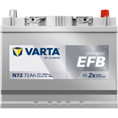 Manche Start-Stopp-Fahrzeuge der Einstiegsklasse sind mit einer EFB-Batterie ausgestattet. EFB-Batterien sollten immer durch ein identisches Originalersatzteil ausgetauscht werden, z. B. durch eine Varta N72 Blue Dynamic EFB 572 501 076 Autobatterie 72Ah.