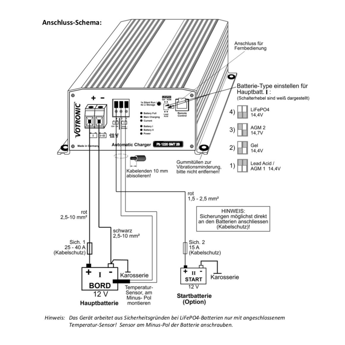 - Bei LiFePO4-Batterien ist der Batterie Temperatur-Sensor erforderlich für die Funktion: Er dient dem Batterieschutz bei hohen und insbesondere bei tiefen Temperaturen unter 0°C.