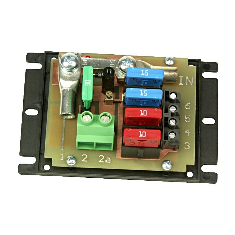 Schraubklemme 6 mm² mit Flachstecksicherung 30 A, z.B. für mittlere Verbraucher oder Ladegerät. Dieser Zweig kann durch eine interne Brücke vom Hauptkreis oder wahlweise getrennt von den anderen Kreisen über eine zweite Schraubklemme 6 mm2 separat versorgt werden.