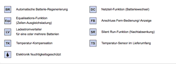 Die Geräteelektronik ist gegen Feuchtigkeit geschützt und sorgt bei starken Temperaturschwankungen für sicheren Betrieb. Am Fahrzeugbordnetz angeschlossene Dauerverbraucher (Funkgeräte, Ladeschalen etc.) werden mit versorgt ohne den Ladevorgang zu beeinträchtigen. Der eingebaute Ladestromverteiler versorgt bei Bedarf auch die Starterbatterie automatisch mit vollem Ladestrom. Über einen Meldeausgang kann bei Fahrzeug-Netzanschluss die Motor-Startsperre aktiviert werden.