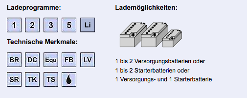 | Für Batterieart: | AGM (VRLA), Gel (VRLA), Li-Ion (LiFePO4), Nass (Flüssig) |