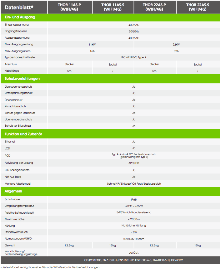 The Growatt THOR 22AS-S EV charger is compatible with all well-known electric vehicle manufacturers thanks to its type 2 connection and has an output power of 22kW.