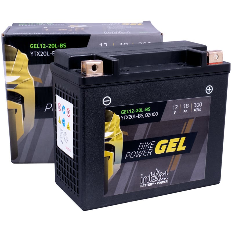 The Intact GEL12-20L-BS Bike-Power GEL 18Ah motorcycle battery (DIN 82000) YTX20L-BS is topped up and charged, so it is ready to go straight away. The Intact motorcycle battery is supplied including connection screws.