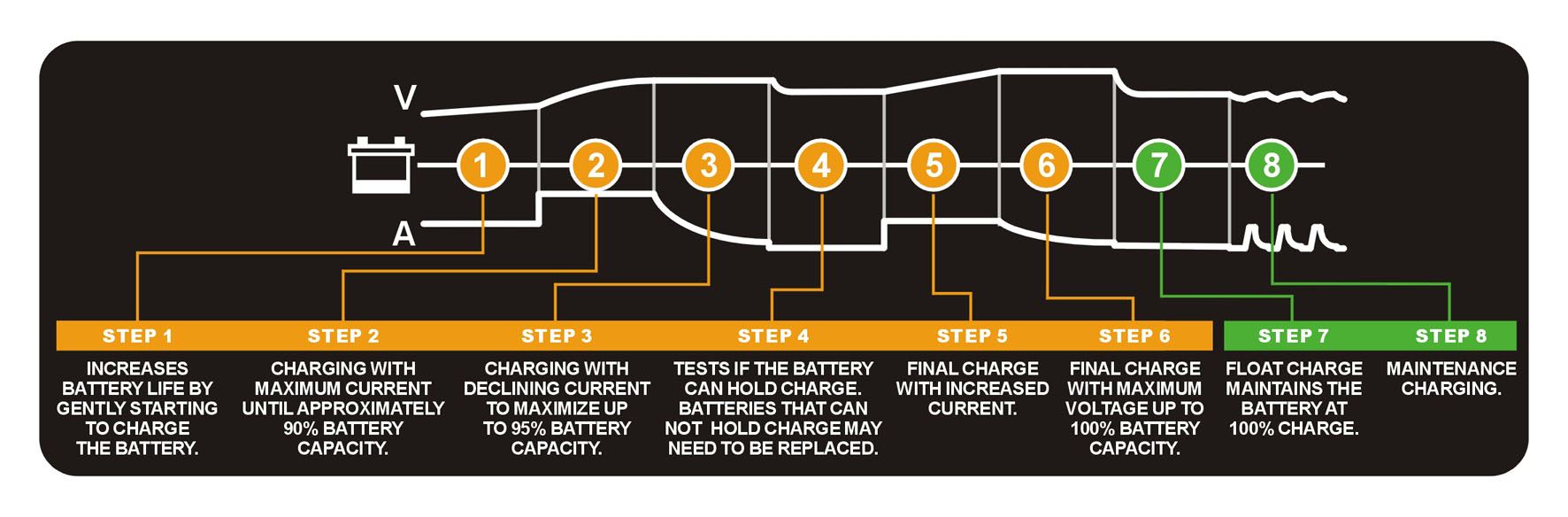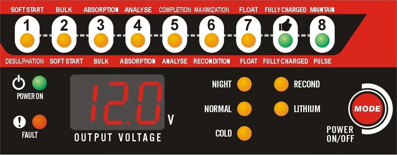| Für Batterieart: | AGM (VRLA), Gel (VRLA), Li-Ion (LiFePO4), Nass (Flüssig), SLA |