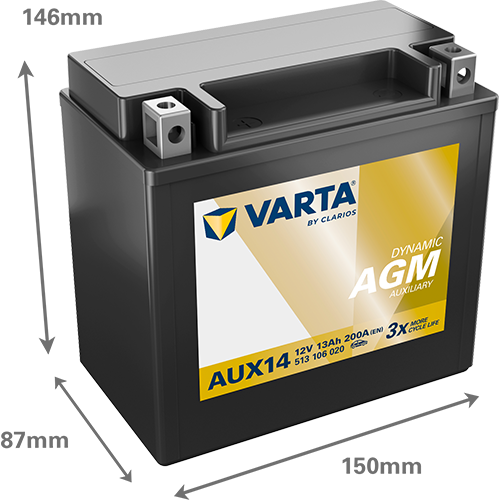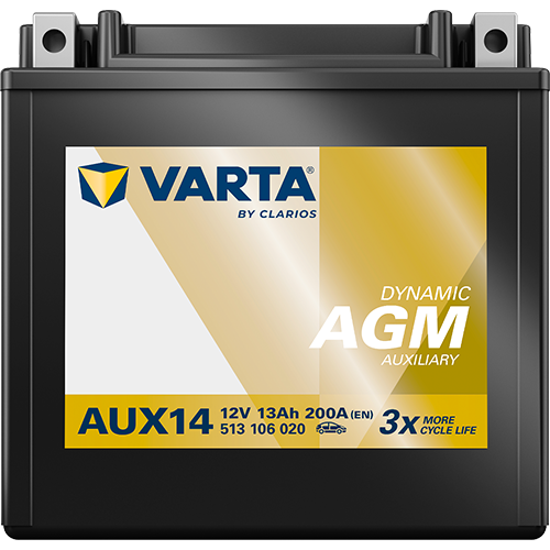 The Varta AUX14 SILVER AUXILIARY DYNAMIC AGM 513 106 020 backup battery 13Ah is the ideal second battery / backup battery for your vehicle .